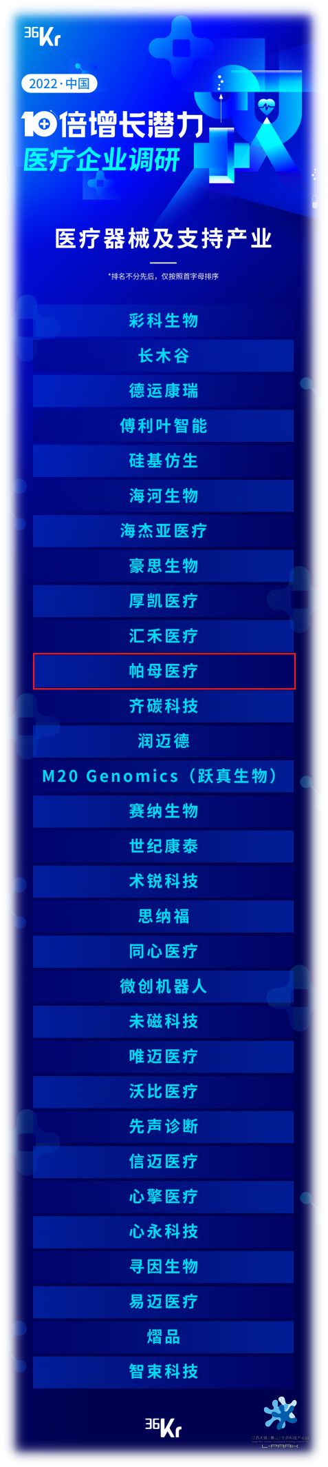 日前,由36氪主導(dǎo)、“2022年中國(guó)10倍增長(zhǎng)潛力醫(yī)療企業(yè)”調(diào)研結(jié)果公布,共100家企業(yè)登上生物醫(yī)藥及其支持產(chǎn)業(yè)、醫(yī)療器械及支持產(chǎn)業(yè)、數(shù)字健康、合成生物四大領(lǐng)域榜單;帕母醫(yī)療上榜其中的醫(yī)療器械及支持產(chǎn)業(yè)類(lèi)。
