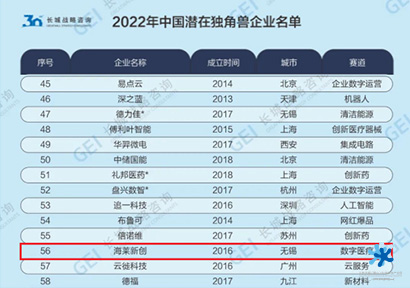 6月20日,2023中國(guó)(蘇州)獨(dú)角獸企業(yè)大會(huì),長(zhǎng)城戰(zhàn)略咨詢發(fā)布《中國(guó)潛在獨(dú)角獸企業(yè)研究報(bào)告2023》;2022年中國(guó)共有653家潛在獨(dú)角獸企業(yè)。惠山生命園的江蘇海萊新創(chuàng)醫(yī)療科技有限公司在數(shù)字醫(yī)療領(lǐng)域蟬聯(lián)上榜,排名由2021年的第442位躍升至第56位。本次無(wú)錫共12家企業(yè)上榜,海萊新創(chuàng)為惠山區(qū)唯一上榜企業(yè)。